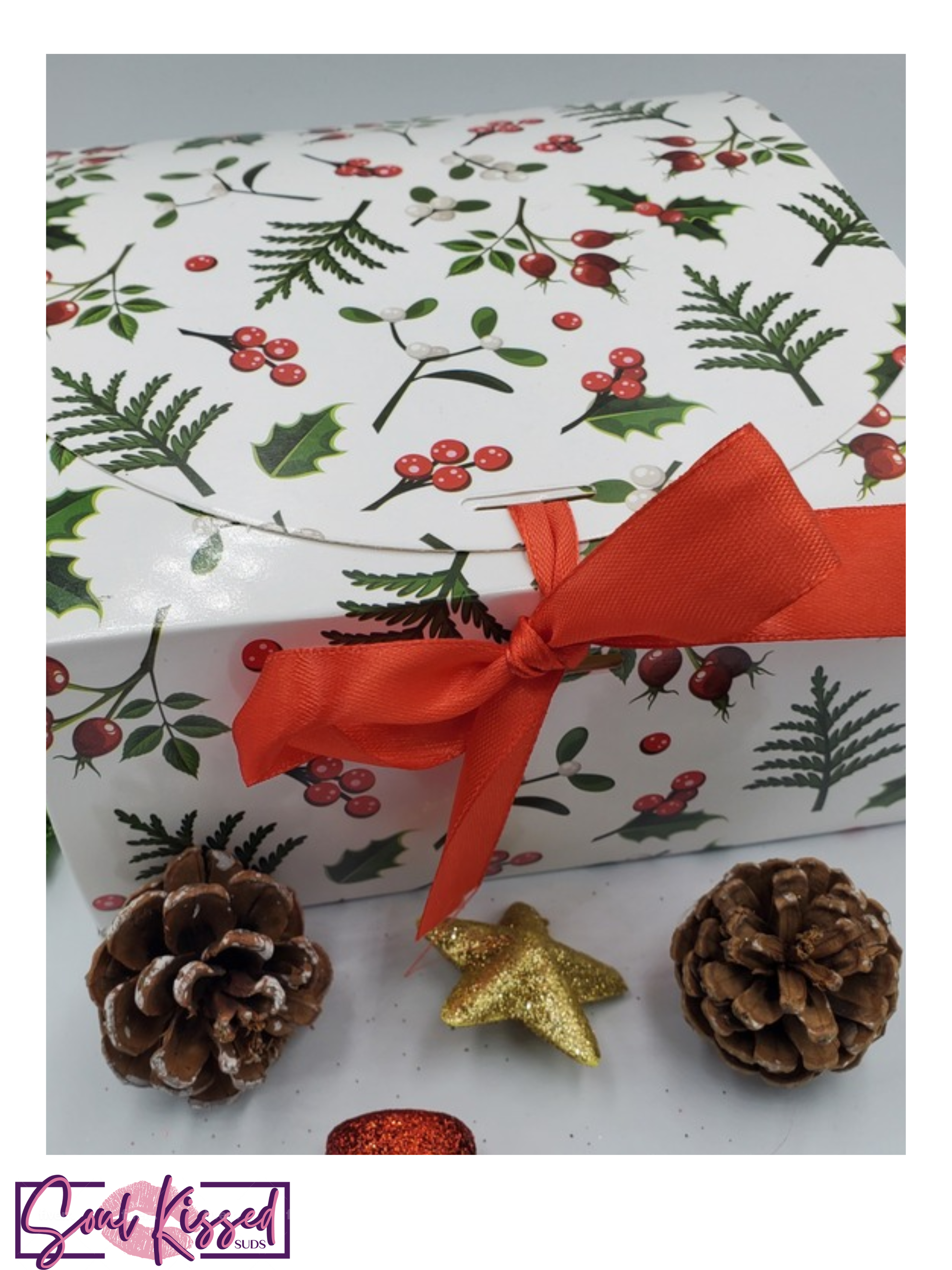 This decorative box is secured with a holiday-themed bow that adds a festive touch!